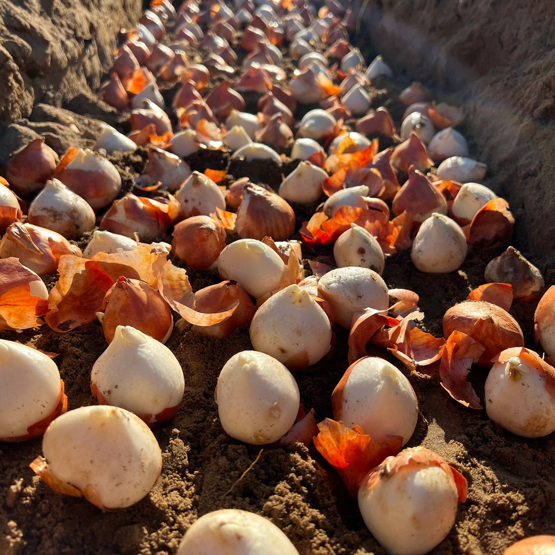 Flower bulbs resting in a soil trench